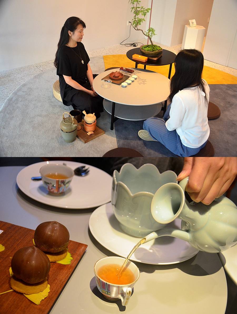 工作人员热情介绍,原来⼀丈⻅⽅空间是⼀个集合茶、艺术品为⼀体的市井⽼宅的当代美学空间,除⽼茶之外,茶艺师还研发了⼀系列符合年轻⼈需求的新式茶饮和适合配茶的各类中⻄式甜品、点⼼,同时与咖乐禧甜品结合,把茶、甜品、⾯包做到完美。