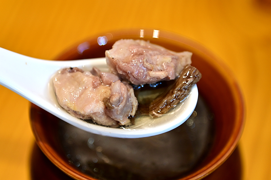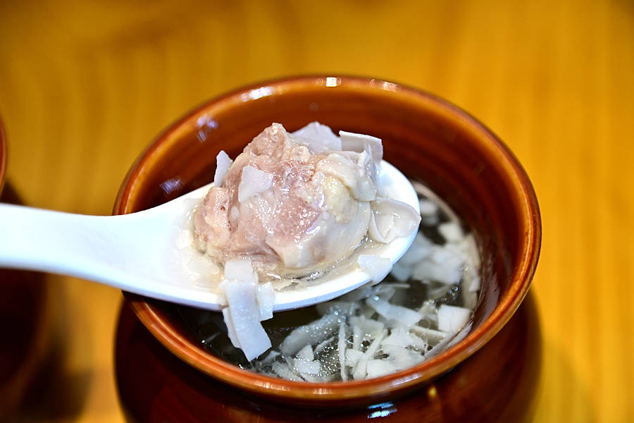 招牌椰子炖鸡汤,鸡肉细嫩,汤汁香醇中带着清甜,吃肉喝汤,无比惬意。