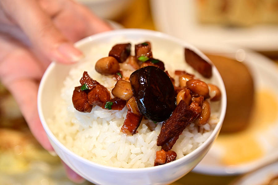 香菇卤肉饭,肉丁、香菇、花生等卤制香浓的酱料,淋在清香的米饭上,真是太好吃了,还搭配了一盘青菜,清甜爽口,营养均衡,完美的套餐。