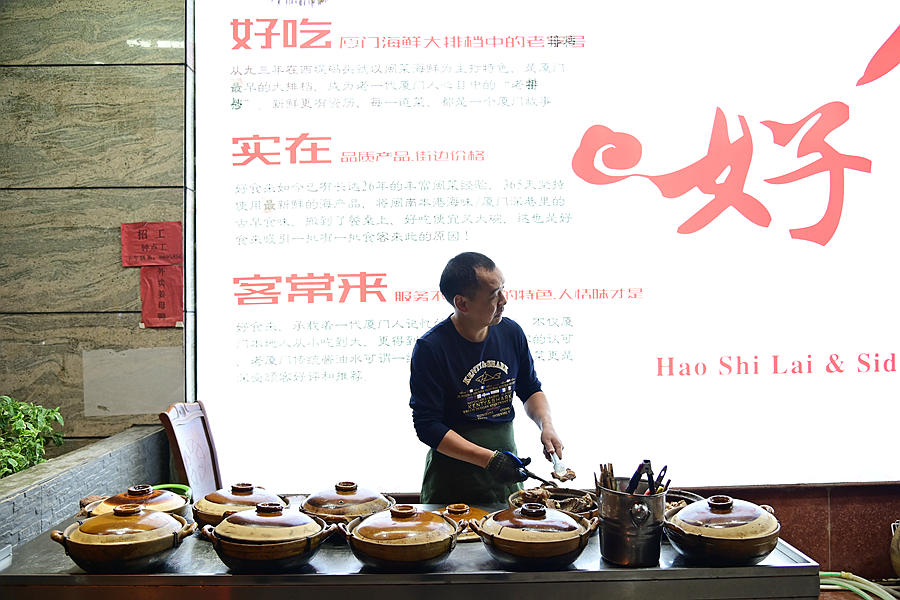 门口有好多砂锅,按传统工艺烹制着厦门名菜姜母鸭,需要多道工序好几个小时方能出锅,香味随风四散,令人陶醉。