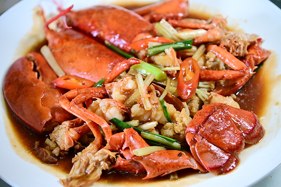 龙虾焖花菜,龙虾壳红肉白,肉质饱满弹牙,鲜美可口,花菜焖至软烂,吸收了龙虾的滋味,也不可错过。