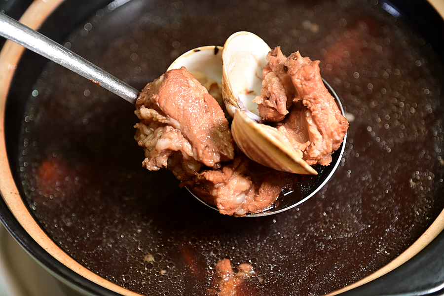 黑蒜排骨汤,锅中有好多排骨,加入黑蒜和花蛤熬制,汤汁鲜香无比,热乎乎喝上一碗,浑身舒畅,美味又健康。