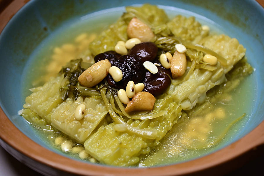 潮式苦瓜煲,天然的嫩绿让人愉悦,加入黄豆、香菇、酸菜、大蒜等多种配料烹制,吃起来清新滋润,清热祛火,如沐春风。
