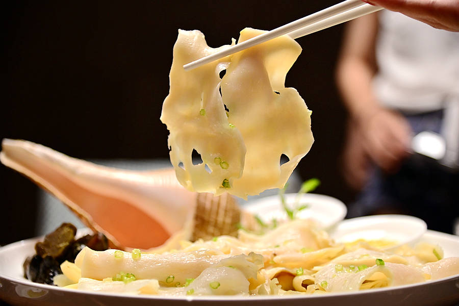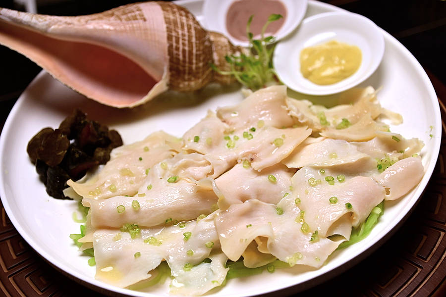 鸡油淋响螺,螺肉片的大小厚薄均匀,色泽温润如玉,口感嫩脆弹牙,滋味鲜美清甜,搭配了两种秘制酱汁,各有千秋,赞不绝口。