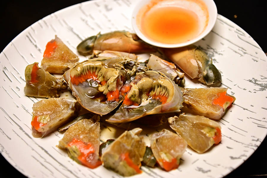 生腌膏蟹,橘红的蟹膏,酒色的蟹肉,一看就让人食指大动,蟹膏紧实香浓,蟹肉细腻鲜美,让人爱不释手。