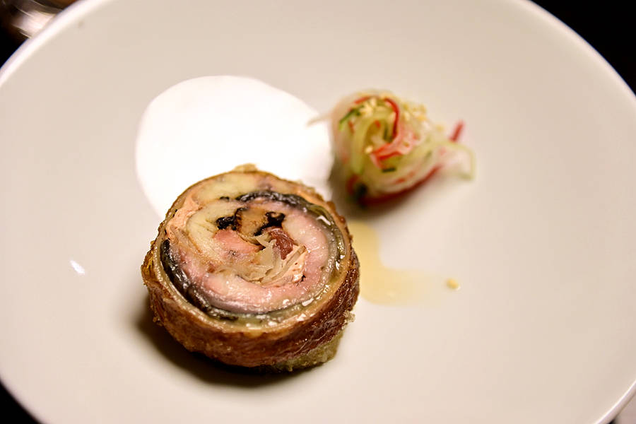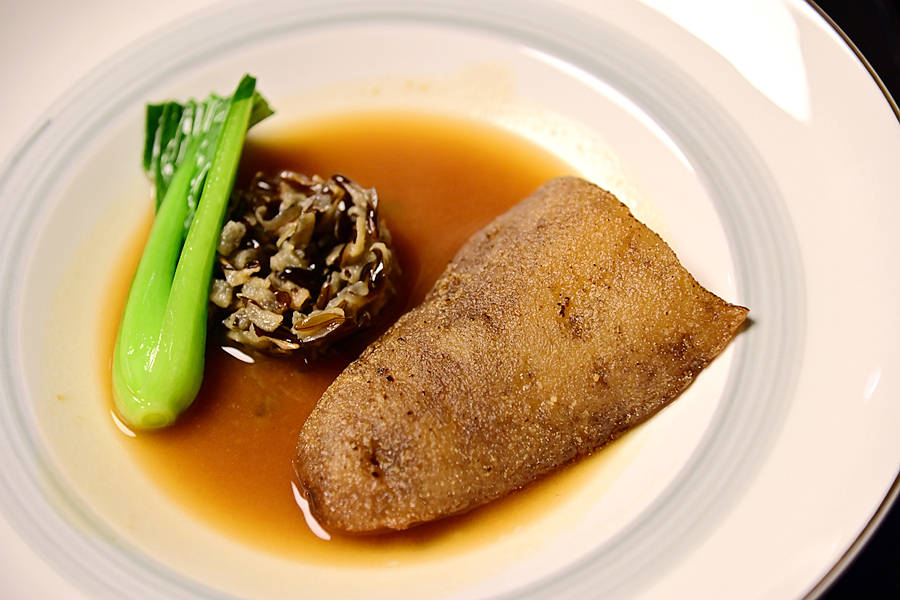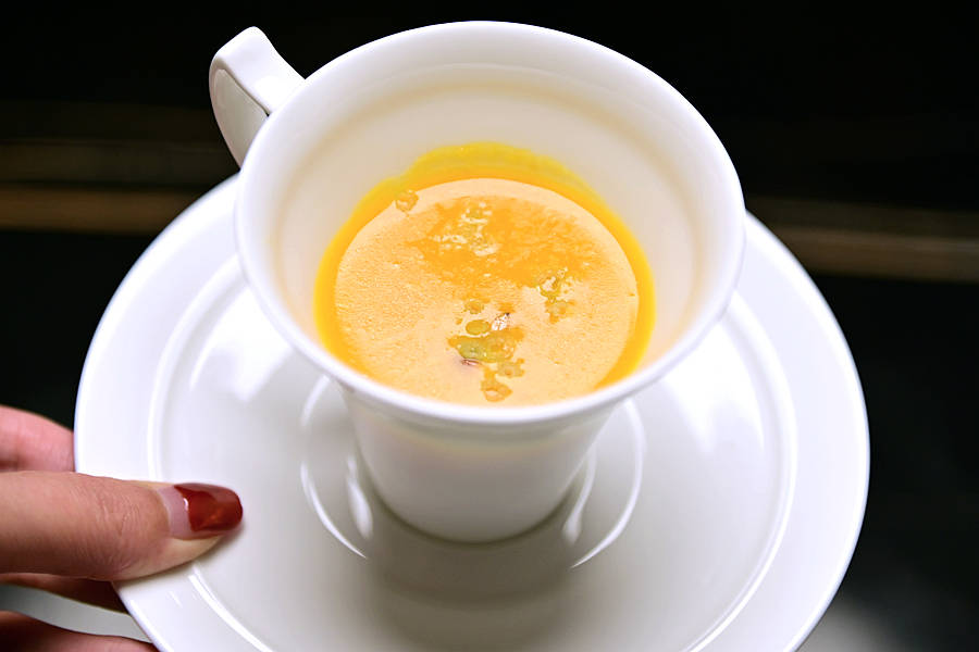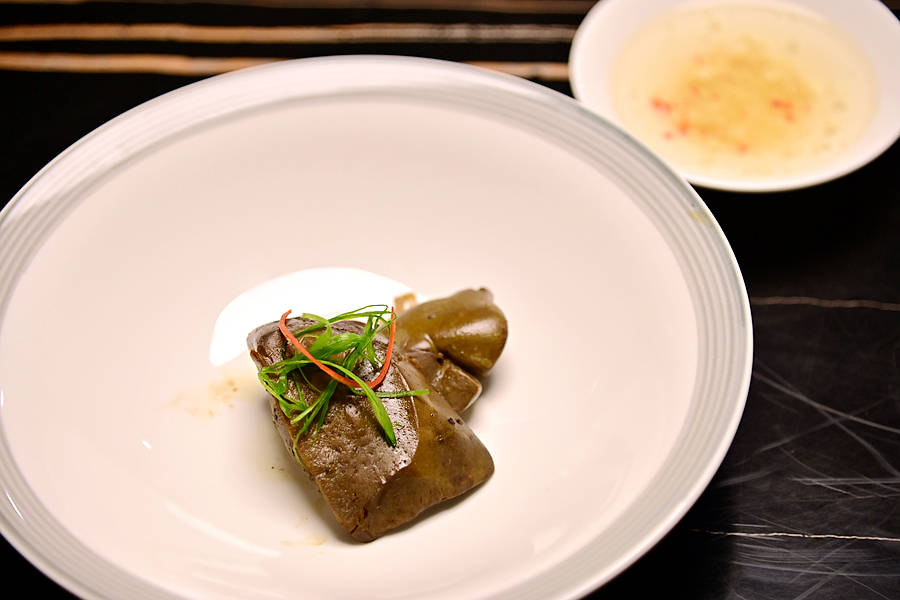 头盘:烟熏狮头鹅肝,选用潮汕著名的狮头鹅肝,闪着清亮的光泽,口感更加紧致扎实,不会像通常吃的鹅肝那么肥腻,香浓中带着淡淡的烟熏清香,回味无穷。