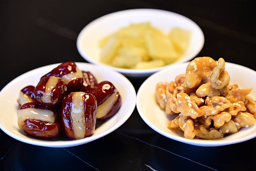 餐前三味:糯心红枣、潮汕咸菜、核桃仁,色彩赏心悦目,红枣软糯香甜,核桃香脆可人,咸菜清脆爽口,胃口大开。