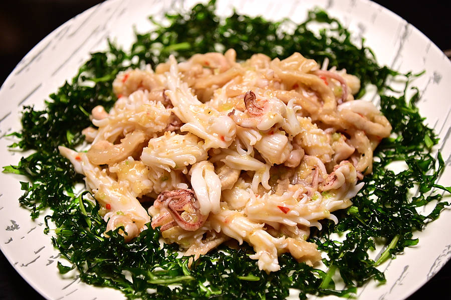 油泡东山管肉筋,洁白的小管花儿般绽放,周围环绕着墨绿的菜丝,造型十分精美,小管和肉筋都是我喜爱的食材,小管紧实嫩弹,肉筋嫩脆弹牙,两者结合的天衣无缝,好吃的停不下来。