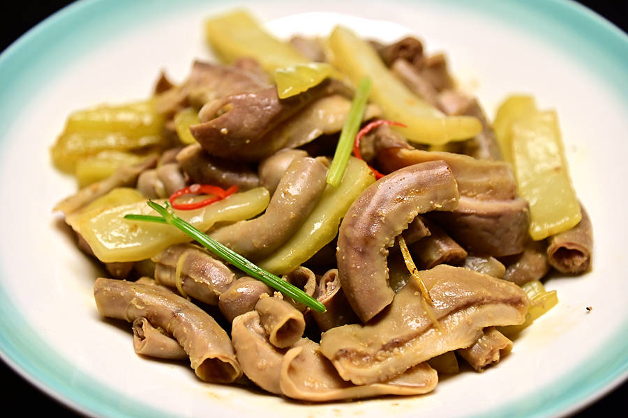 咸菜炒肚肠,猪肚柔韧有嚼劲,小肠扎实又筋道,猪肚和小肠特有的肉香中带着咸菜的咸香,口感味道俱佳,配饭配酒都是极好的。