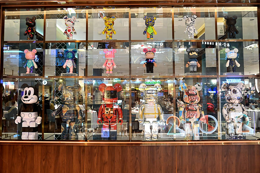 橱窗里摆着好多网红积木熊公仔,可可爱爱,必拍照打卡!