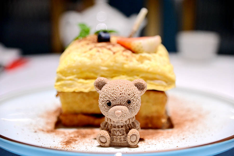 招牌酥皮漏奶,这是网红必点的,一只惟妙惟肖的小熊端坐盘中,后面是金黄诱人的酥皮漏奶,香甜美味,一下就瓜分一空。