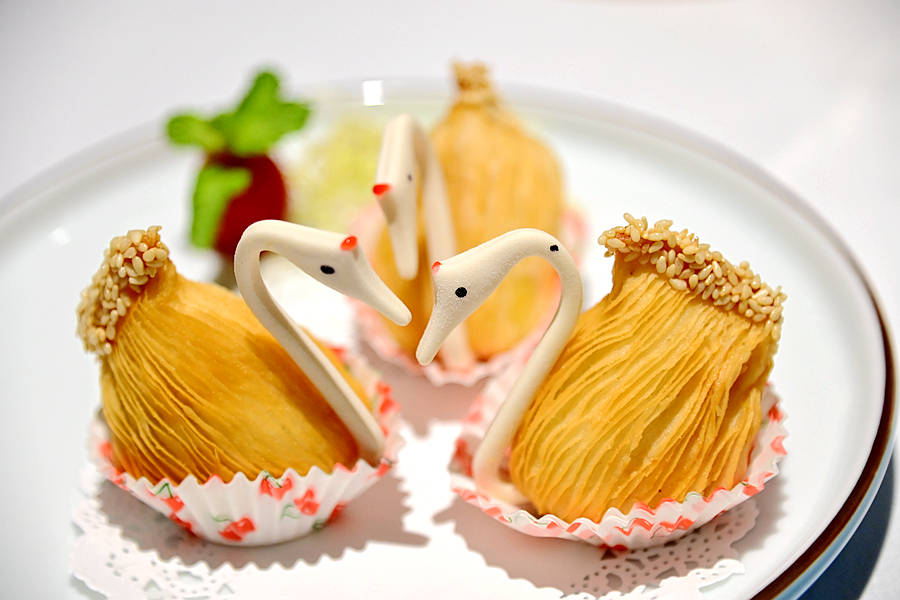 天鹅榴莲酥,造型好美啊,柔美的线条,恬静的神情,仿佛优雅的在湖面上私语,送入口中,想不到好看更好吃,外皮香酥薄脆,内馅饱满浓郁,热乎乎的榴莲醇香溢满口腔,让人吮指回味。