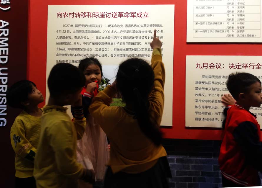 一群小学生在椰子寨战斗历史陈列馆里参观。放猪江湖 摄