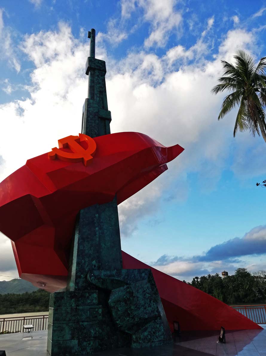 万泉河中,舟楫穿行,青山绿水,和谐共生。阳光和暖的河边,椰子树亭亭玉立,灌木丛葳葳蕤蕤,空旷而凝重的椰子寨战斗广场的主题雕塑格外醒目:一支巨大的步枪造型直指蓝天,枪杆下半部则飘逸出一面有弧度的大面积的鲜红的党旗。一群和平鸽飞翔于蓝天白云间,一派宁静、祥和的景象——这是琼海大地94年后的今天。