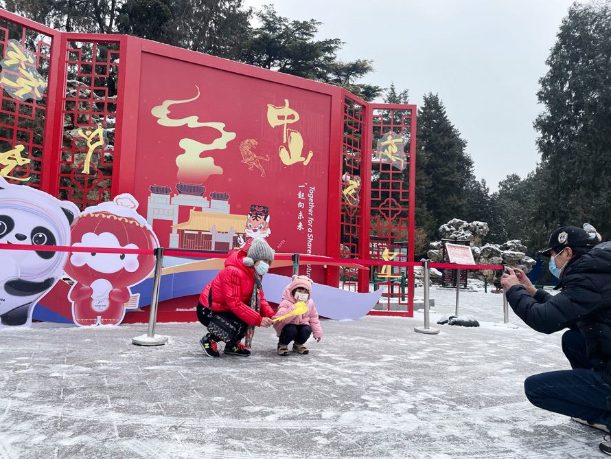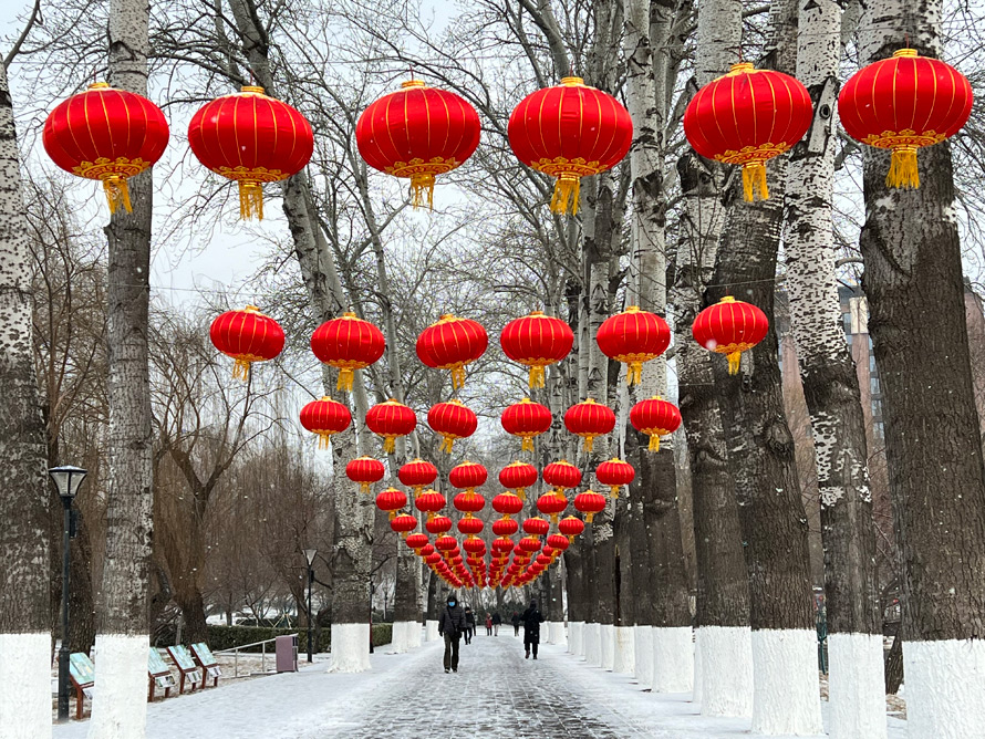 2022年北京的第一场雪纷扬而至,在大寒节气里为公园增添银白色彩,园林古建和树木山湖都披上了新装,红灯映雪,引来众多游客拍照留念,迎接春节和北京冬奥会的到来。