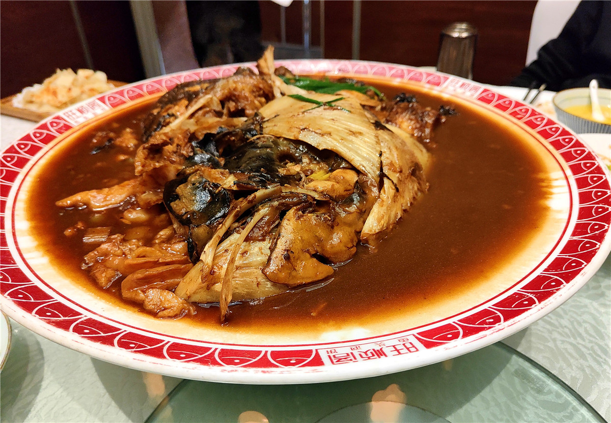 纯净的湖水饲养的鱼,没有异味,凸显了鱼的鲜美。我们要了6斤多重的半个鱼头,按照服务员吃鱼头六步法的提示:先吃鱼头中最嫩的部分鱼划水;其次是胶质含量最为丰富的鱼唇和鱼脸;第三步是鱼眼;第四步是富含“脑黄金”的鱼脑;第五步才是高蛋白低脂肪的鱼肉;第六步将外皮酥脆、劲道的大饼,沾上了久炖的鱼汤汁。