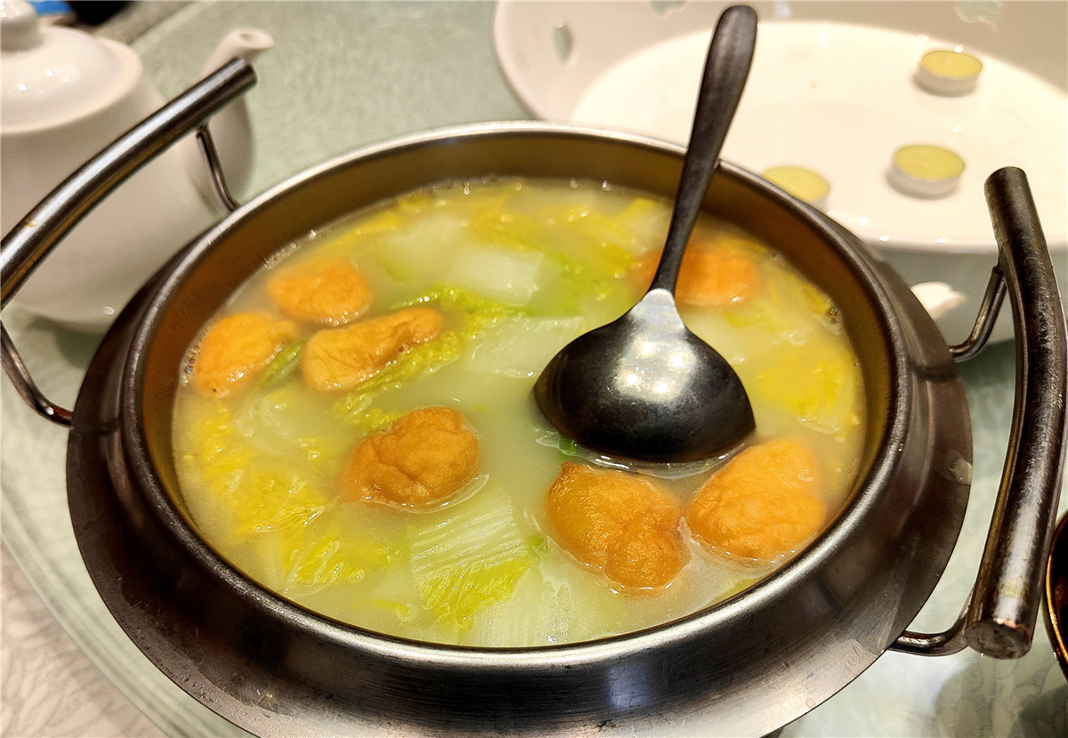 砂锅马踏湖莲藕,看似平常的一道菜,爽口、滑润,清甜。炝炒圆白菜粉丝是点击率比较高的素菜,吃过大鱼大肉,再配上它,恰到好处。浓汤手打鱼腐娃娃菜汤鲜肉嫩,是一道适合老人和小孩需求的汤菜。