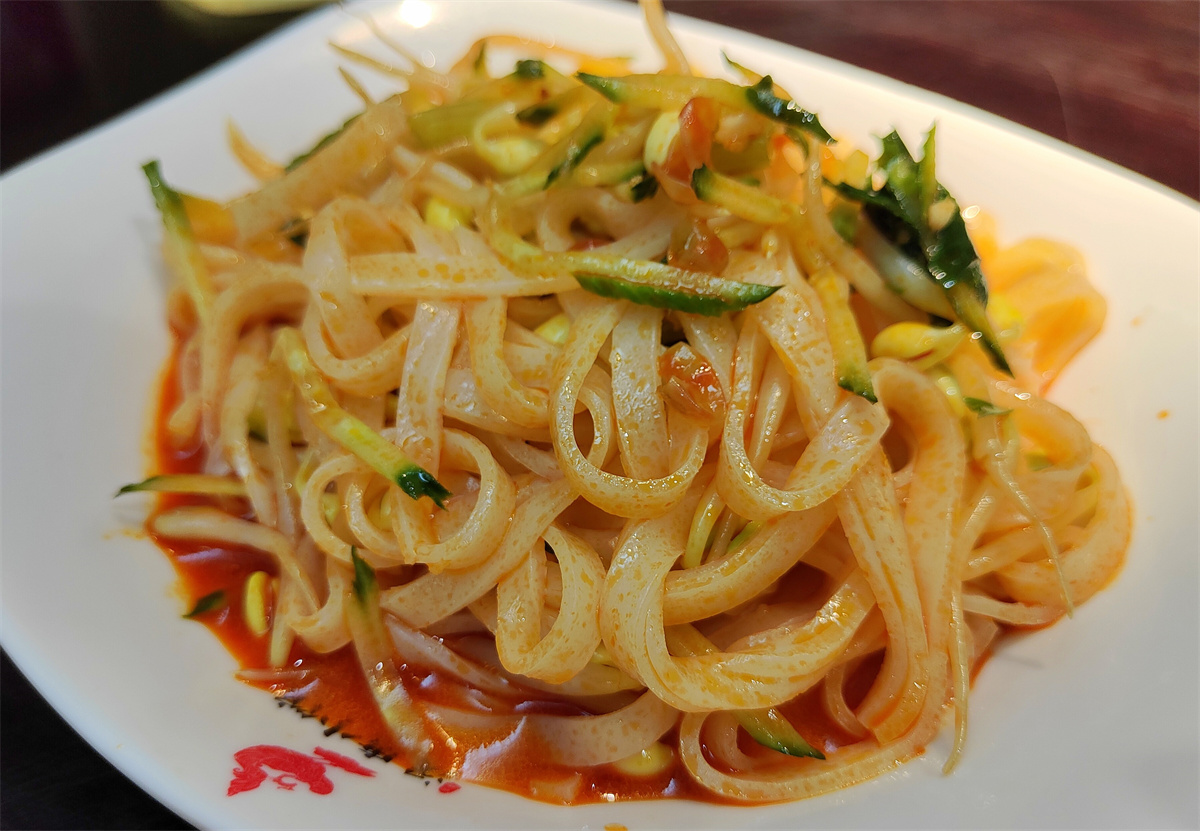 记得有一年去西安开会,会议间隙去老姨家串门,姨妹给我打包了一个米皮,告诉我,这是附近一家小吃店做的,很正宗。回到宾馆天色已晚,拿出米皮和同屋住的姐们儿一块尝味道,果然名不虚传,别看模样一般,但是滑润爽口,咸、辣、鲜、香。由此心心念念喜欢西安的米皮,到汉唐小馆,寻找西安味道,米皮也是必点小吃,因为这里寄托着一种念想儿……
