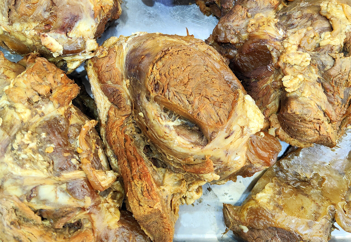 每次进店,看得最多的是他家的熟食。酱牛肉、羊拐筋、筋头巴脑等品种不少。每当服务员用大铁盘端出刚出锅的熟食,空气中弥散着肉的香气的时候,不少顾客都会情不自禁买点熟食尝尝,因为味道的确不错。久而久之,我总喜欢买点他家的酱牛肉送给朋友们品尝,还一定要强调,这是房山窦店的清真食品。