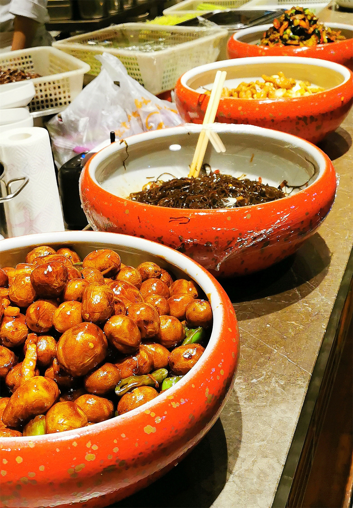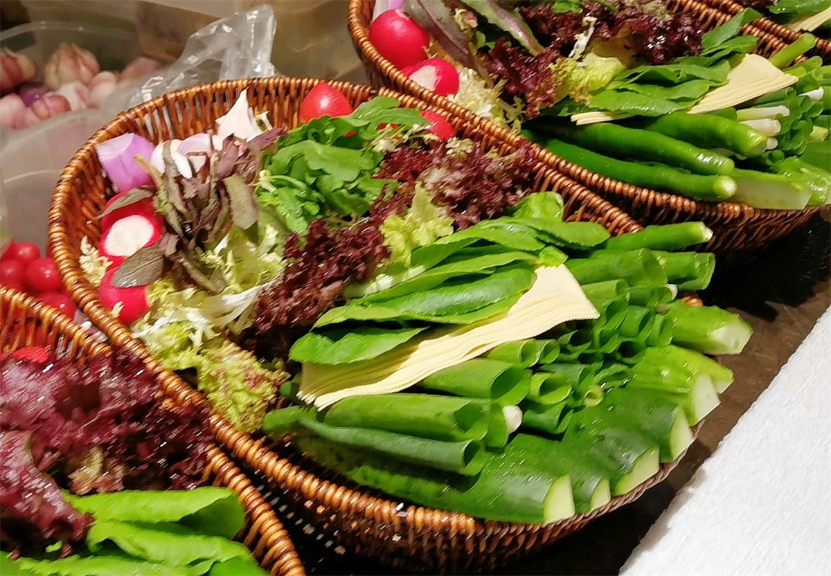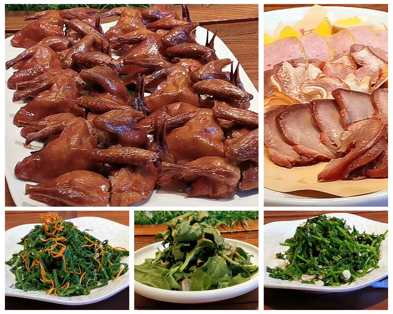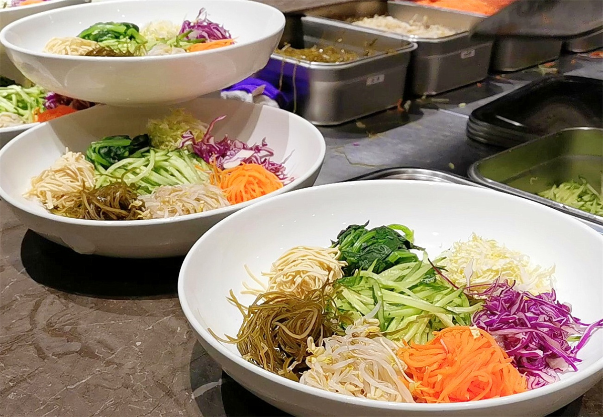 一楼的明档操作间,分类明确。主食、凉菜、咸菜、熏酱肉菜、炖菜、水果,东北地域美食特色鲜明。其中最吸引人的招牌菜烧鸽子、大拌菜、东北大拉皮、晒衣大饼等,让喜欢东北风味的食客倍感亲切。