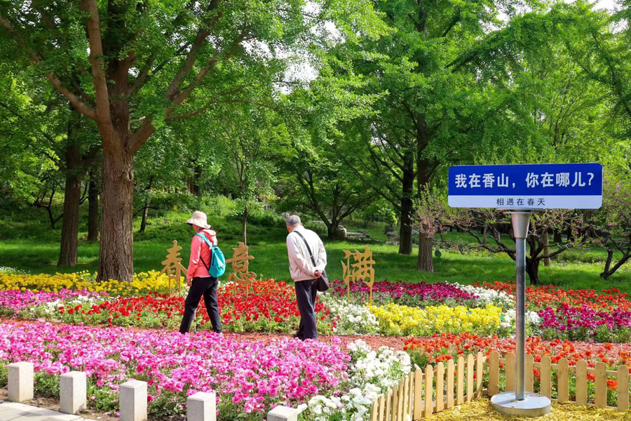 在香山公园的佳日园、枫林村、知松园景区,公园以“香山春望”为主题,精心进行“万物·生”“春山·归”“春意·满”等花卉小品布置,小品采用香山主打花卉——“山花之王”花毛茛以及凤仙花、大花飞燕、角堇、虞美人、绣球、羽扇豆、白晶菊、情人菊、大花葱等花卉,带来五彩斑斓的盎然春意,吸引不少游客驻足拍照留念。