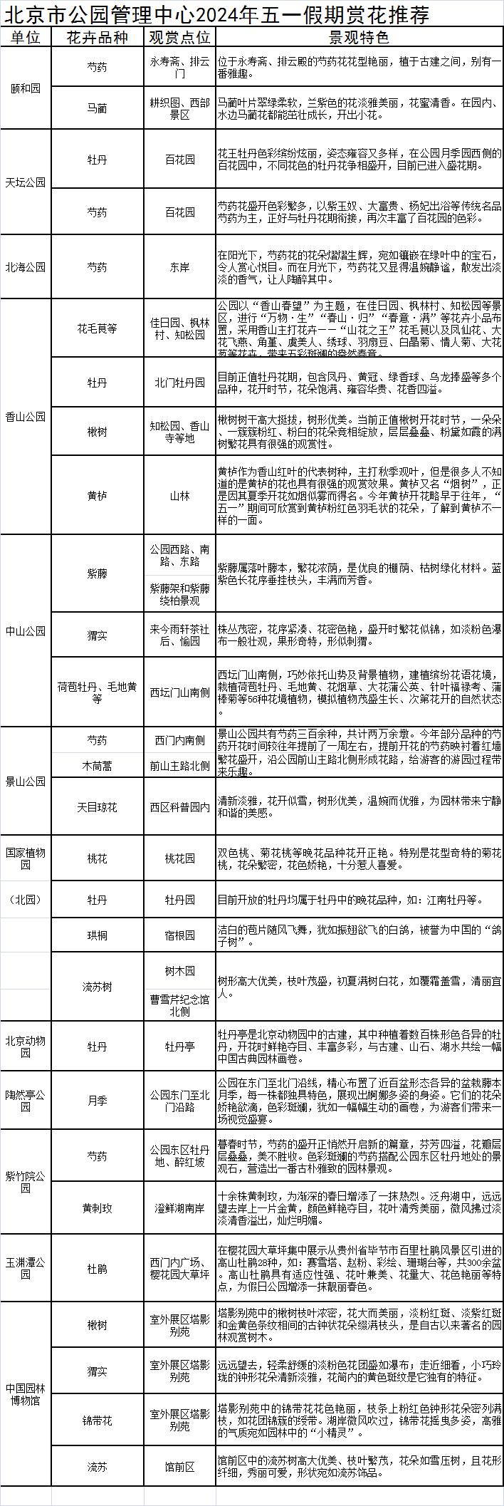 五一假期,气温舒适,北京市属公园里景色宜人,芍药、流苏、黄刺玫、花毛茛等花开正美,正是踏青赏花的好时节。记者从北京市公园管理中心获悉,市属公园及中国园林博物馆推荐28处踏青赏花好去处。