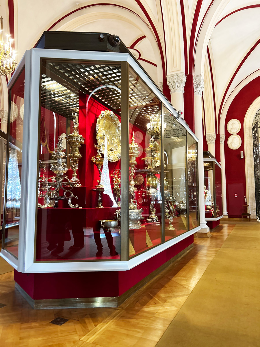 说这里是俄罗斯的“藏宝库”,这并不是一个比喻,而是实实在在的藏宝库,堪称俄罗斯皇家国库,据说当时是由瓦西里三世为了制造和存放兵器而建立的,后来也用于生产工艺品。在彼得统治时期,所有的银匠、铁匠和手工艺者都被送去圣彼得堡,而这座军械库则逐渐成为了一个存放皇家珍宝的博物馆。
