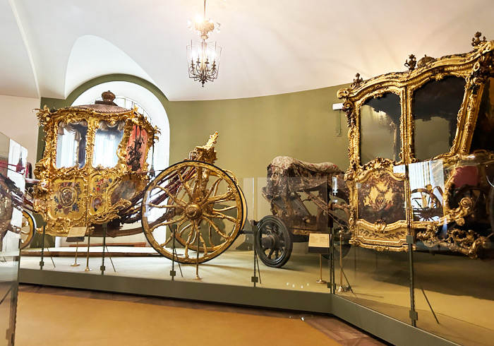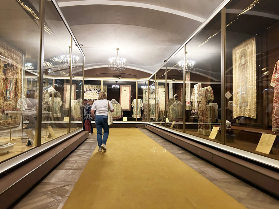 这里的藏品耀眼夺目,几个世纪以来,收藏了大量的皇家工坊制造的贵重物品,以及外国使节馈赠的国礼。克里姆林宫皇家兵器、珠宝、黄金刺绣,以及古代国家权利象征物(摩诺马赫皇冠、纯金权杖、权标)、沙皇的加冕服、皇冠、沙皇时期的战利品、古代贵族马车等许多珍贵物品,伊凡雷帝的象牙宝座、沙皇阿列克塞的钻石宝库,以及叶卡捷琳娜二世的婚礼长裙、13-18世纪的镶满钻石的宝座、彼得大帝的长袍、12-19世纪世界各地的金银制品等许多珍贵的物品都可以在这里看到,这些来自12至20世纪的物件,每一个都承载着厚重的历史人文。就连军用的铠甲、盾牌和火枪上都雕刻着精美的纹饰,与其说是武器,毋宁称其为艺术品更为恰当。