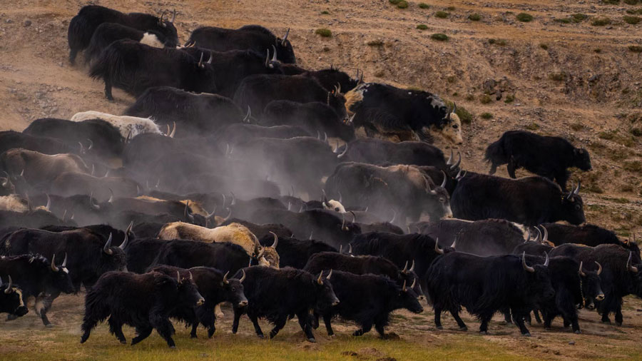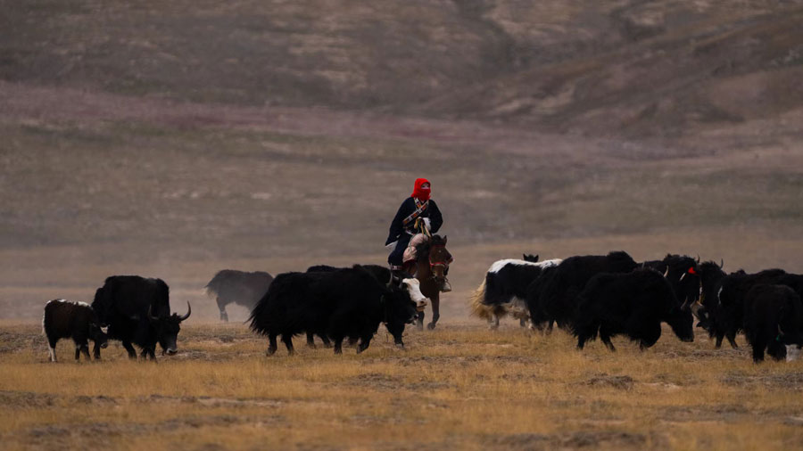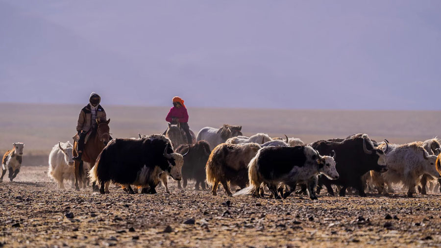 都兰县位于青藏高原腹地的柴达木盆地,拥有草原面积38 11.04万亩,其中天然牧草地3711.7217万亩:其他草地98.914万亩,人工牧草地0.4046万亩,草原综合覆盖度为52.97%。 9月中旬全县123.3088万牛羊转场完成,都兰县是青海省畜牧业资源大县。为顺应牧草生长周期与气候规律,当地牧民延续千年传统,实行季节性轮牧。(摄影/先宫 希日尖措)