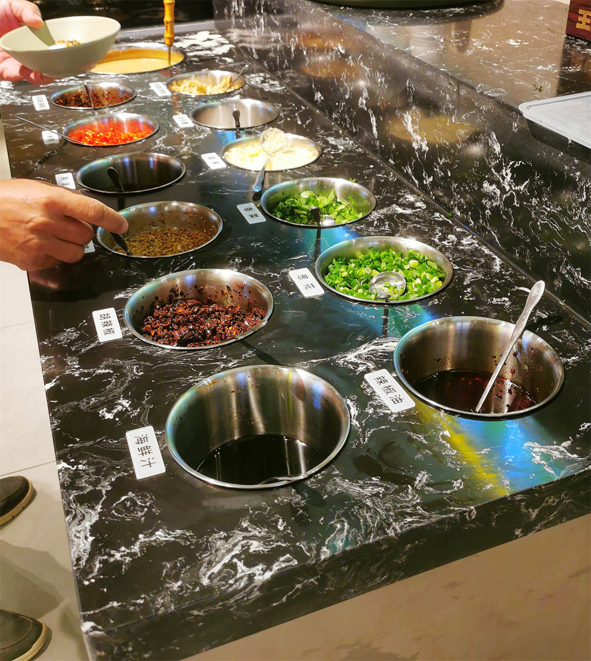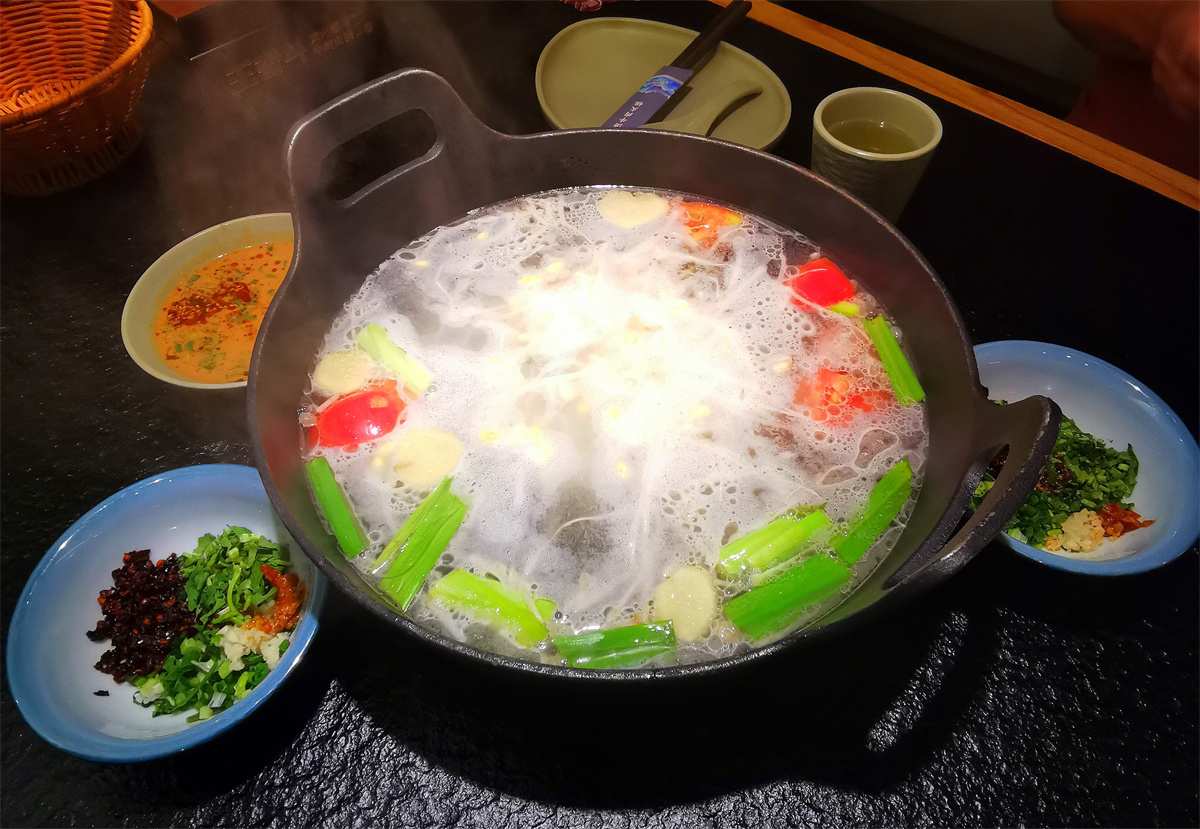 锅底分凯里红酸汤与苗家白酸汤两种。红酸汤风味浓烈,苗家白酸汤口感要柔和,酸度却丝毫不减。锅底里,番茄、豆芽、葱段相映,红黄绿交织,看着就让人食欲大开。小料的选择也很丰富,除了糊辣椒蘸水、蒜香苏子酱蘸水、秘制海鲜汁、芝麻酱这四种特色蘸水,还有13种调料可自由搭配,完全能调出自己最爱的口味。