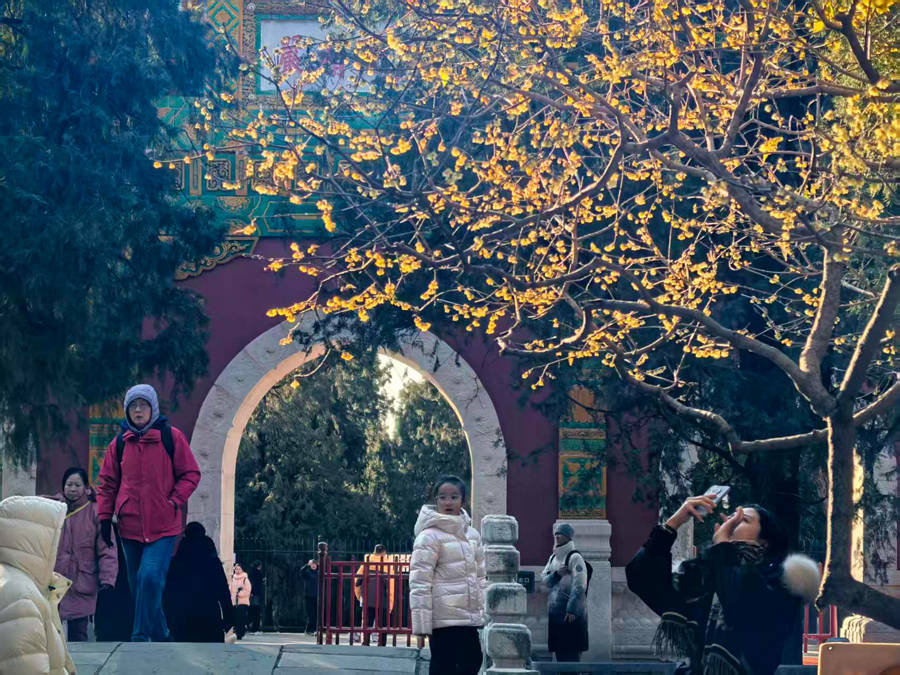 国家植物园地势开阔,已逐渐成为市民游客短途出行、亲子徒步的又一目的地。此时位于北园卧佛寺内的数株早花蜡梅正值盛花期,金黄的花朵缀在枝头,暗香浮动,虬曲的枝干搭配素雅的黄花,与古建红墙相映成趣,吸引游客们驻足观赏拍照留念,记录下这冬日限定美景。天王殿前的池塘里,数百尾红鱼游荡其间,新年见鱼,年年有余,游客们在这里拍照打卡,许下新一年的美好愿望。