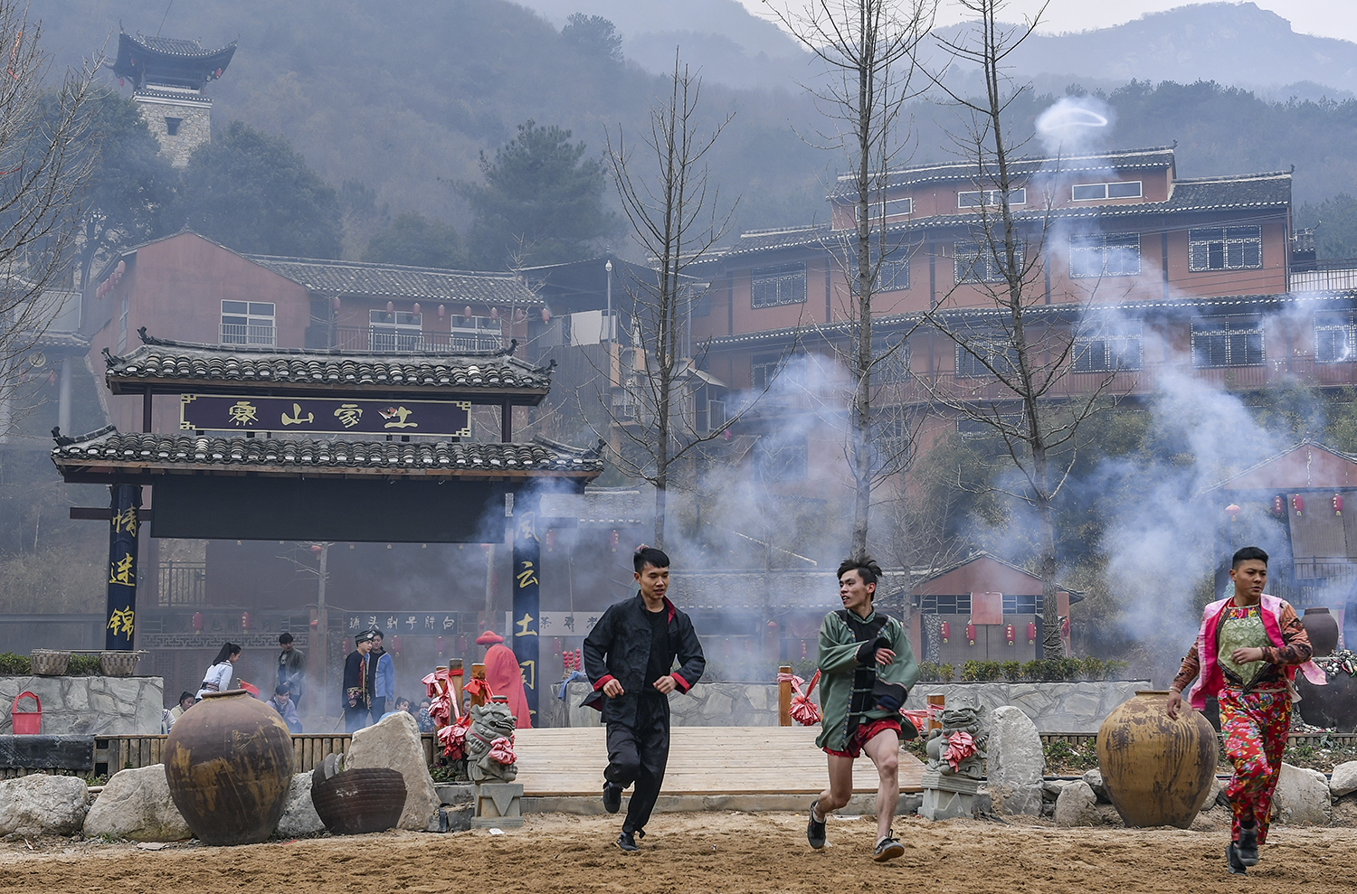 这门喜事定下后,土家山寨上下都忙碌开了,为这场婚礼做准备。王府门前,人们载歌载舞,一派喜庆气氛。