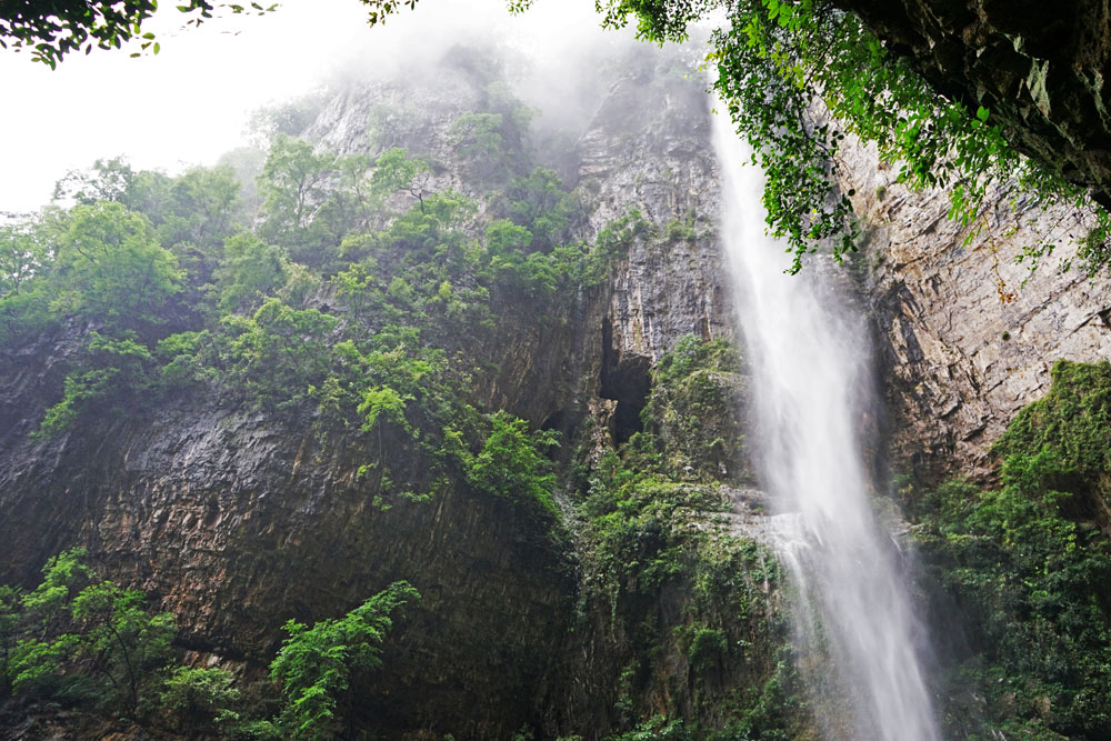 沿着步道一直前行至一处崖璧尽头,你会看见一条巨大的瀑布从九天风流直下下,以势不可挡的速度落入崖底,还未等你靠近,那如雨水雾便笼罩眼帘。