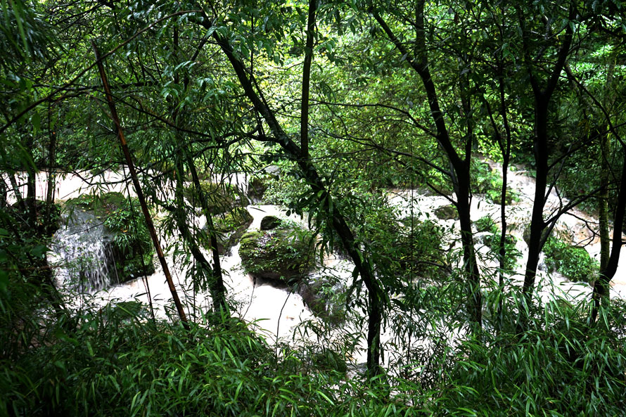 与河道落差频繁出现的是,两侧悬崖上的瀑布,一个又一个,不经意间抬头仰望时,它们如玉带一样飘与山顶,落入密林深处,或者最终流淌于这条漂流的小溪里吧,墨绿色石壁上,青苔泛水,竹林沿岸而生,苍翠了荒野。