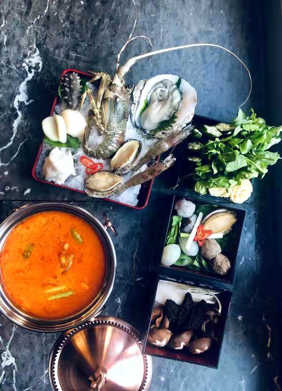 酸汤龙虾海鲜锅则是汲取了贵州酸汤开胃之功效,将龙趸斑、龙虾仔、基围虾、元贝、响螺,辽参、生蚝和羊肚菌、鹿茸菌,冬菇,灵芝菌,野生竹笙等山珍海味融为一体,品的是鲜、香、酸、辣,要的是余味无穷。