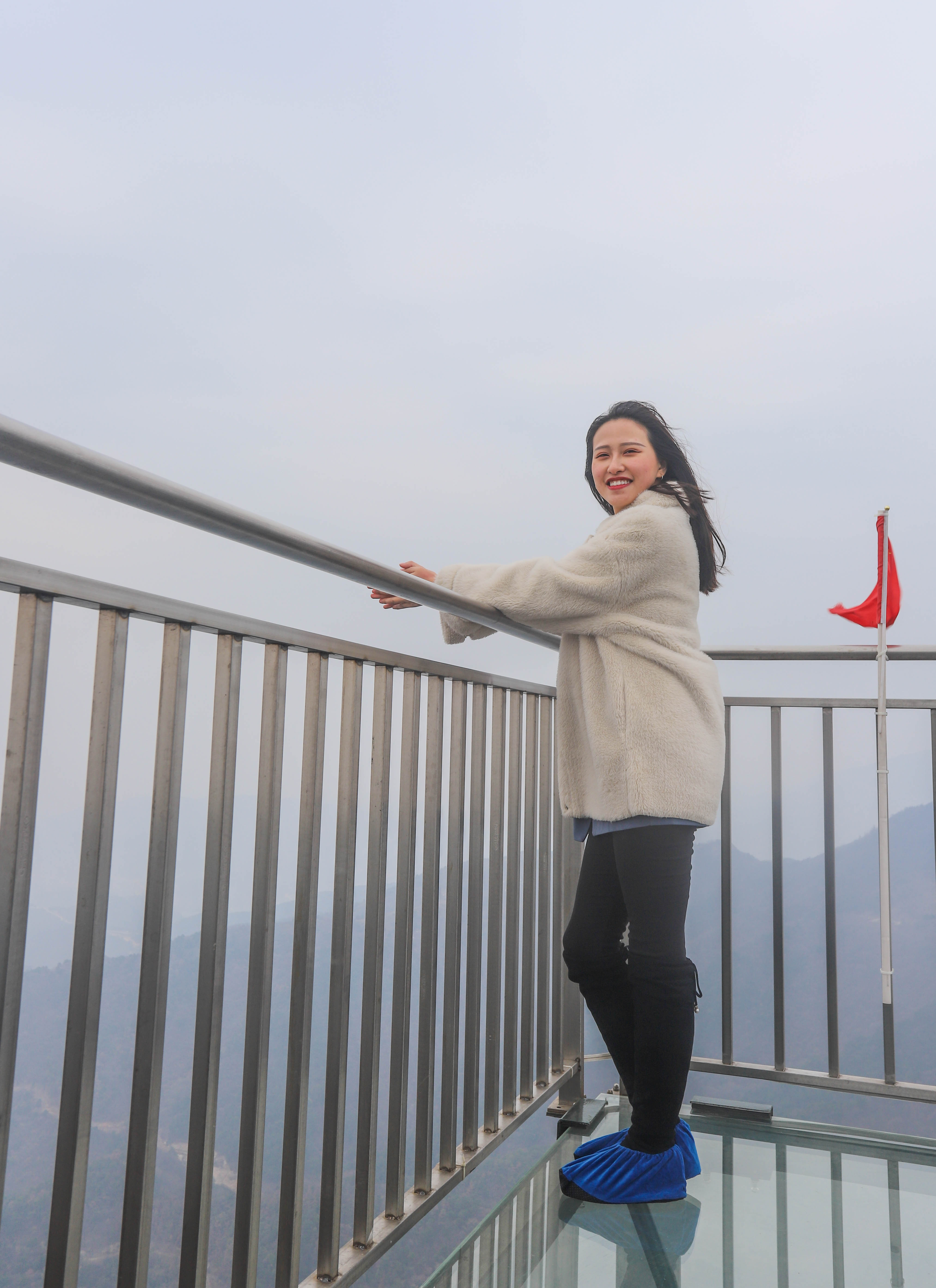 当乘坐景区摆渡车抵达云雾山颠的时候,风非常大,幸好观景台这里提供免费的大衣租借,穿上厚实的军大衣无疑是非常保暖的。接下来,雄鹰自然要亲身走上玻璃观景台,体验一把咯。