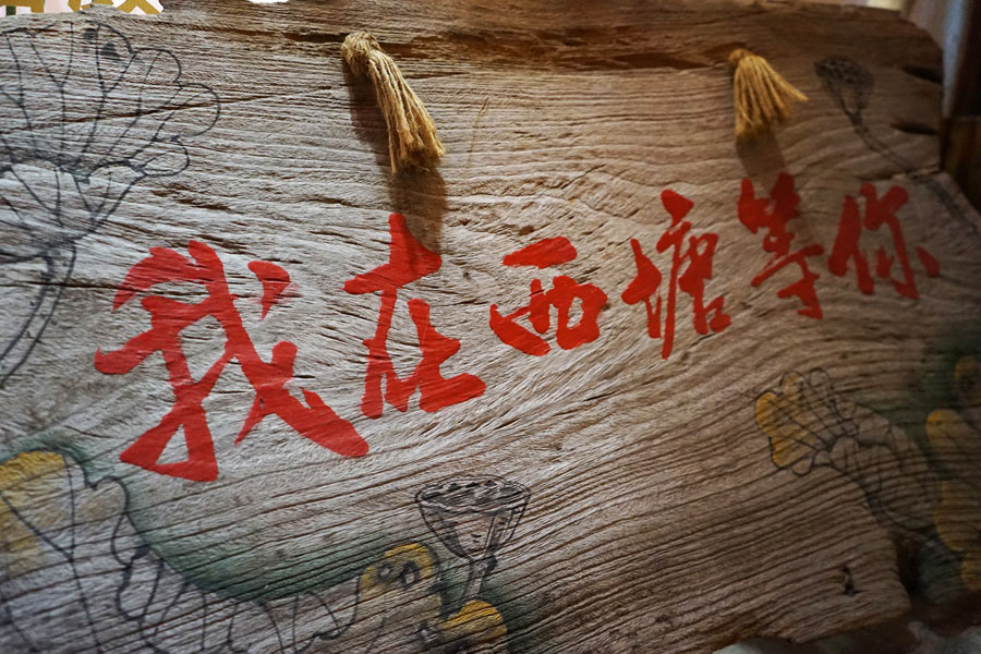 杨柳池塘,乌篷短桨,白墙黑瓦以及屋檐下的红灯笼……巷弄与溪水交错,石桥与灯影相和,呈现出穿越梦幻的世情与古事,而在一侧的墙壁,悬挂的木板上写着“我在西塘等你”。