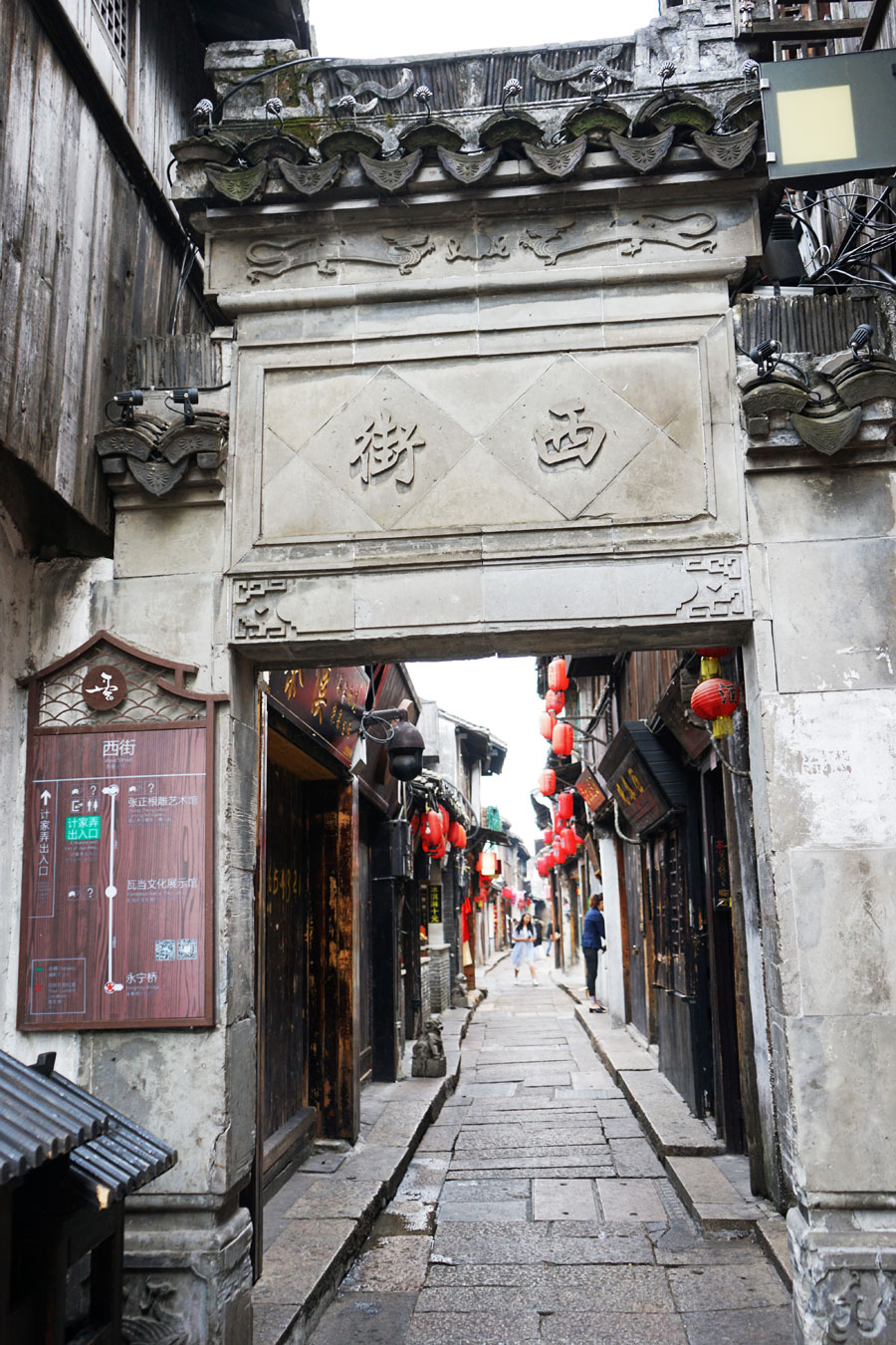 西塘的西街是一处有味道的巷弄,它的最小宽度仅供人们挑担换肩,由于临街房屋二楼以上还有屋檐延伸,两两相对的楼阁近在咫尺,搭起竹竿就可以晾衣晒被,打开窗户就可以倚窗谈心,甚至可以握手,完美地构成一道别致的小镇风景。西街上也有很多值得到此一游的地方,比如石皮弄、种福堂、西园、中国纽扣博物馆以及江南瓦当陈列馆等。