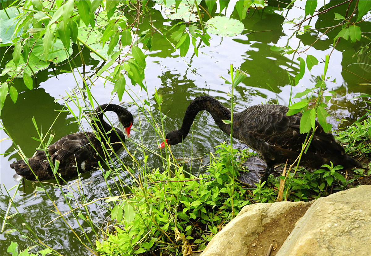西南角那片水域中的小岛是藻鉴堂遗址。藻鉴堂的四周是荷塘,夏日游园,这里是园中亮点,荷香四溢,沁人心脾。 黑天鹅在塘中时隐时现,成为人们目光和镜头追逐的对象。
