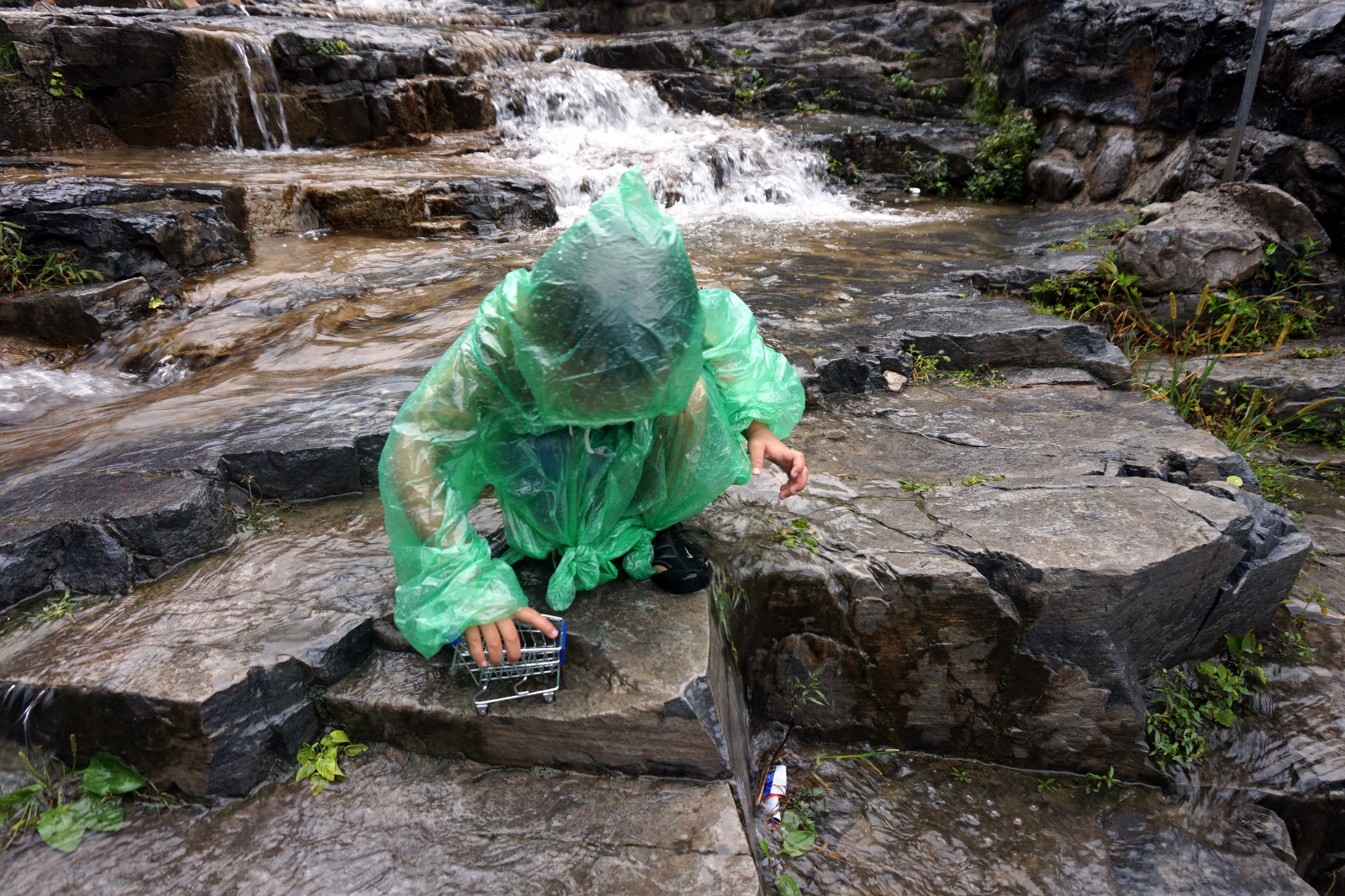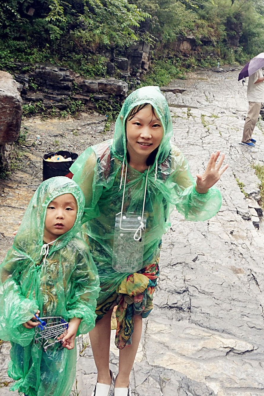 期间我和小锟都买了雨衣,穿在身上不用担心被淋湿。等到了山脚下的时候,真的被这里的美景陶醉了。或许是因为雨中有些雾气,或许是因为小雨蒙蒙的感觉,这种秀美会让来到这里的人非常值得。我带着小锟走进了潺潺流水中,小锟非常开心的玩水。