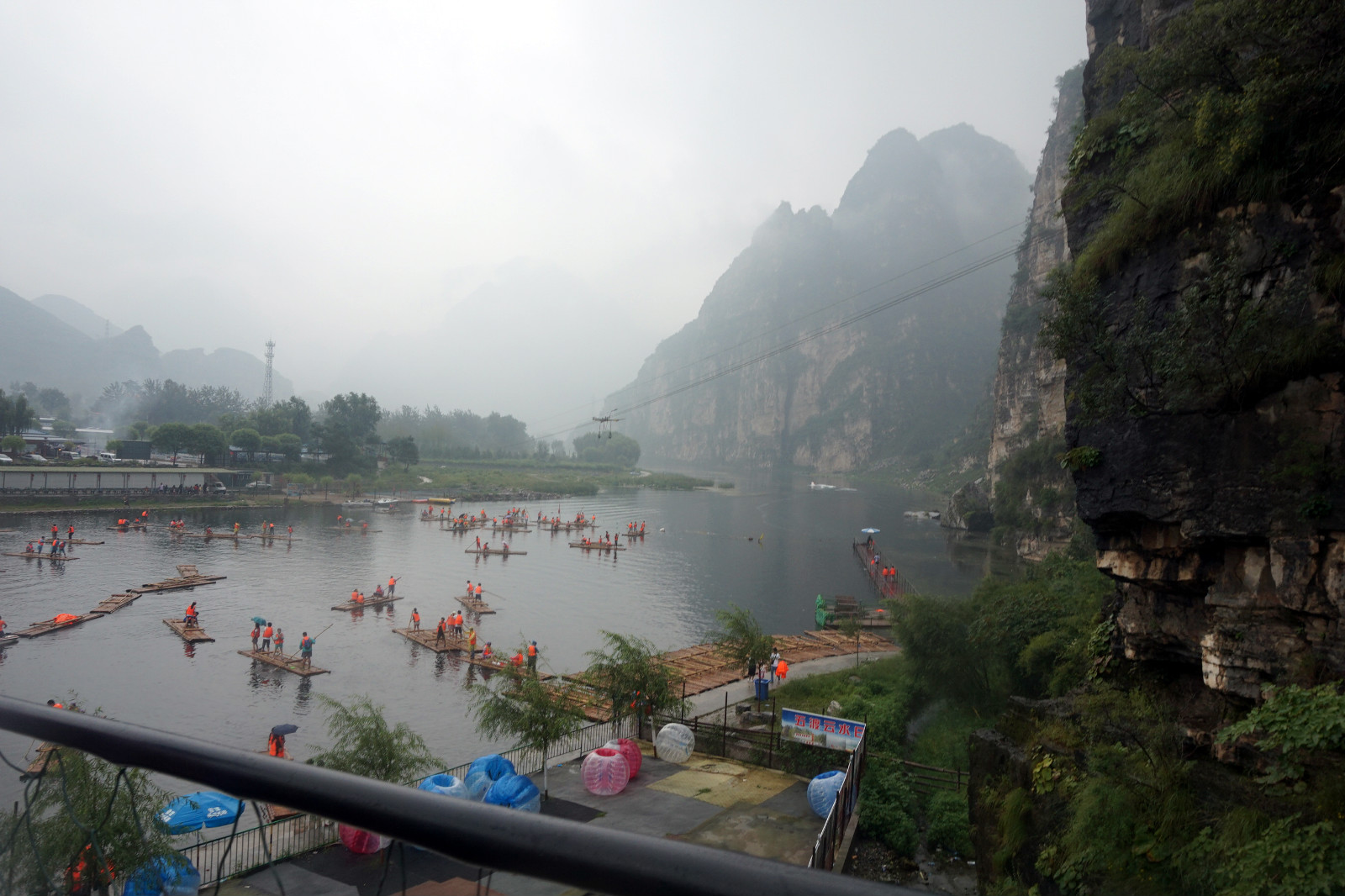 当然这个时候需要求助一些朋友帮忙拍合照,虽然合照不多,但也是一种纪念。山脚下有几匹马,是这里的商贩经营的项目,可以选择骑马下山,到景区门口。我们选择电瓶车,比较稳当。到了景区门口一定要走吊桥,吊桥很长,也很美。在桥上可以看到很美的山景,桥下是竹排小船,别有一番风味。