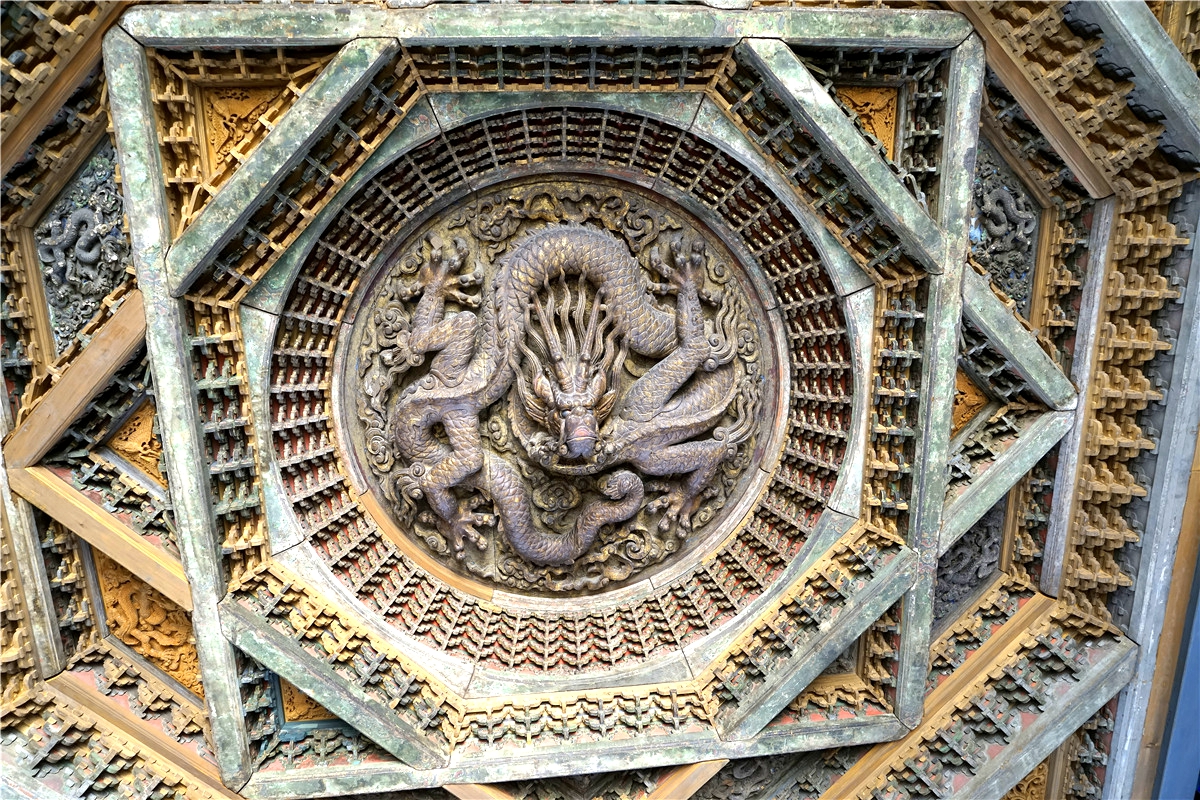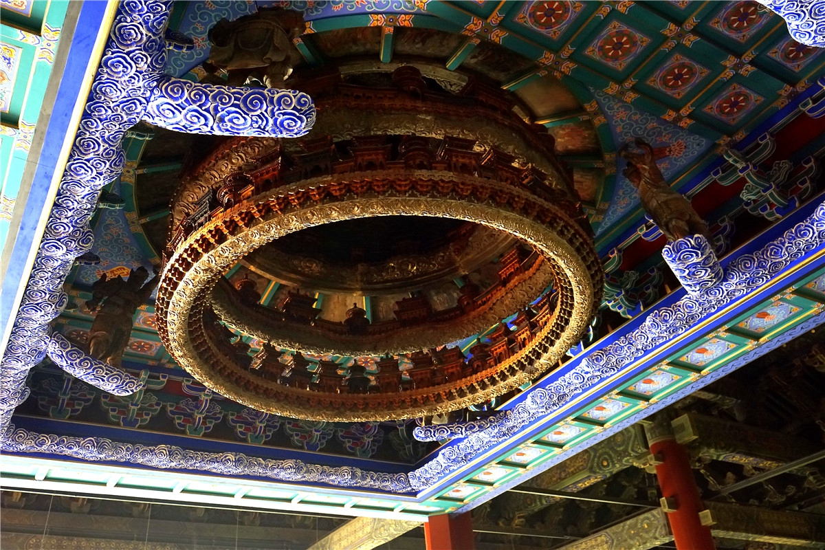展厅中不仅能够看到详实的图片资料,还可以看到作为展厅古建的本来面目。拜殿既是太岁殿院落的穿殿,也是官员代祭太岁神的祭拜之处。走进大殿就能隔门看到太岁殿,一个气势宏伟的建筑。抬头看到上方的木雕图案,精美、霸气。