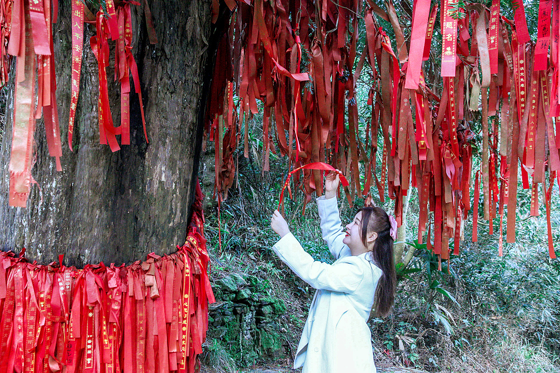挺佩服这样因一个念头就敢于扶老携幼举家搬迁的壮举,村子里还有一棵罕见的雌雄同体的相思树,也就是红豆杉。植物学家也解释不了为何可以雌雄同株。这棵奇树在村里有个口口相传的故事:早年村里有对家境贫寒的恩爱夫妻,丈夫为了能让妻子过上富足日子就出外经商,立志不成功不回家。一别经年,丈夫终有小成,便托人带话,除夕归家。不想这天却下起大雪,阻慢了他的脚步,直至天亮才入村,发现村口等待的妻子已经冻僵了,丈夫伤心欲绝,将爱妻葬在她倒下的地方,并种了一棵相思树,不久丈夫相思成疾也抑郁而终,两人合葬一处,随后就出了奇事,先前栽的相思树竟长出一雌一雄两枝。这种专家也解释不了的自然奇迹,只能说爱情执念创造出的奇迹吧。