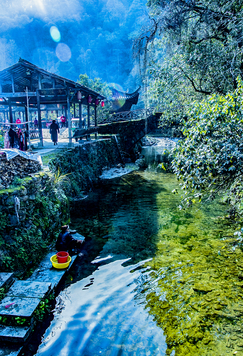 源头古村属小家碧玉型,村子不大,房舍也不多,但麻雀虽小五脏俱全,周围的山水是极好的,四面青山环抱,古树参天,一条清澈的溪流淙淙穿村而过,小潭,石桥,茶亭,青苔拥簇,古意十足。