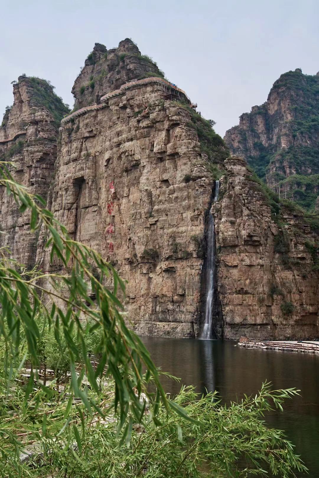 我要去的登山玩水的地方——乐谷银滩,就在十渡的三渡。当你看到路旁的悬崖峭壁上有一处倾泻而下的瀑布,旁边还有一条凌空而建的栈道,那就是目的地了。