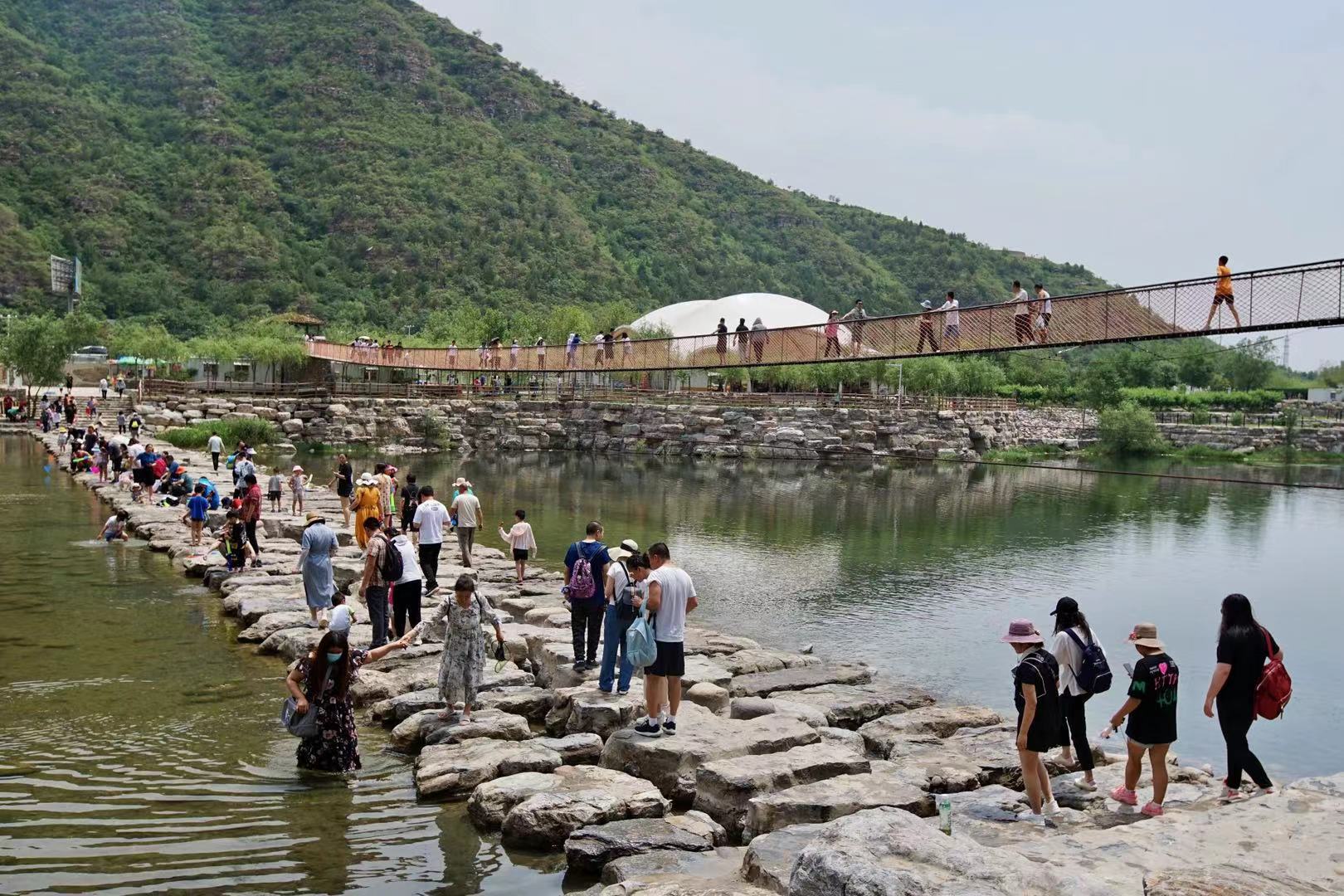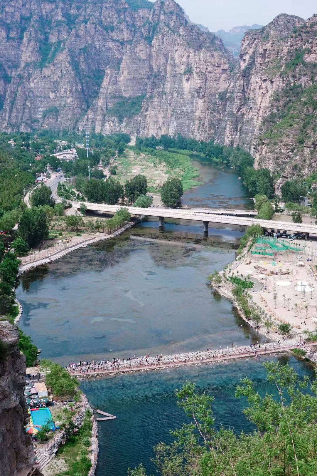 30多摄氏度的天气,没什么比玩水更能感受凉爽的了。刚进乐谷银滩不远,就是拒马河,横跨河面之上的石桥已经不再是一条进入景区的通道了——这里如今已经成了嬉水乐园。