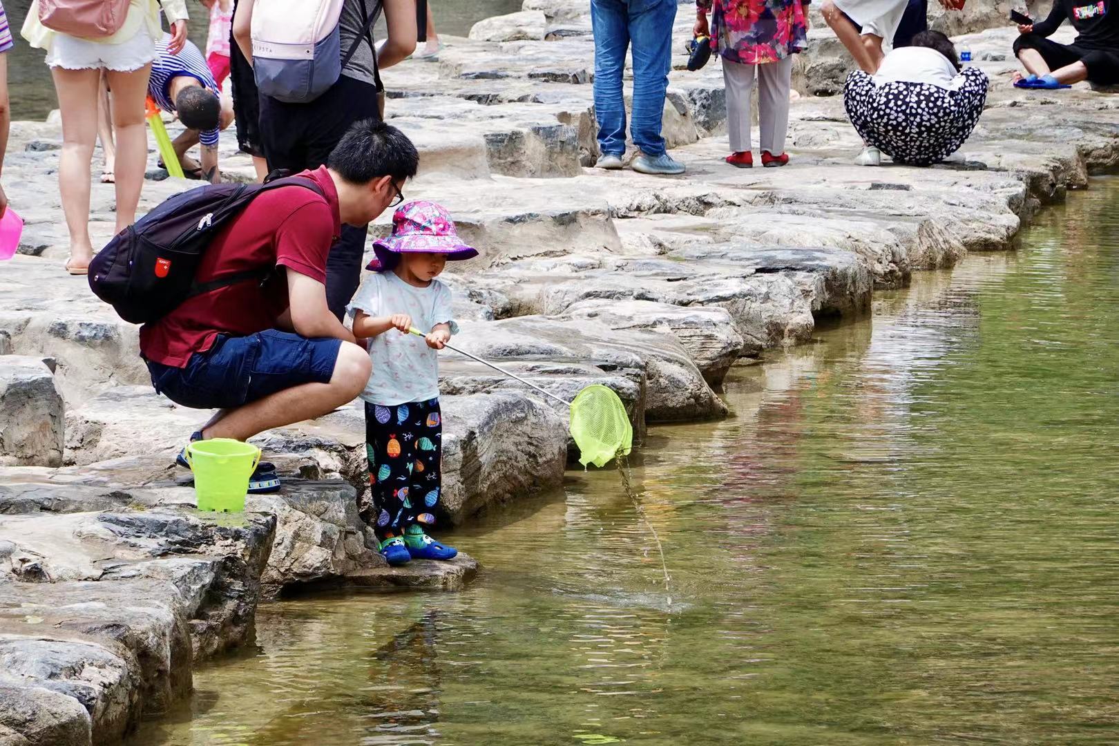 谁都不想错过水带来的清凉与舒爽,不仅小朋友们玩个不停,连带孩子的大朋友都忍不住,撸起裤腿,蹚着水下河了。孩子们似乎已经装备好了,手拿滋水枪,乐此不疲地一遍遍玩着吸水、喷水的游戏,或者是手握鱼网寻找水中游动的小鱼。