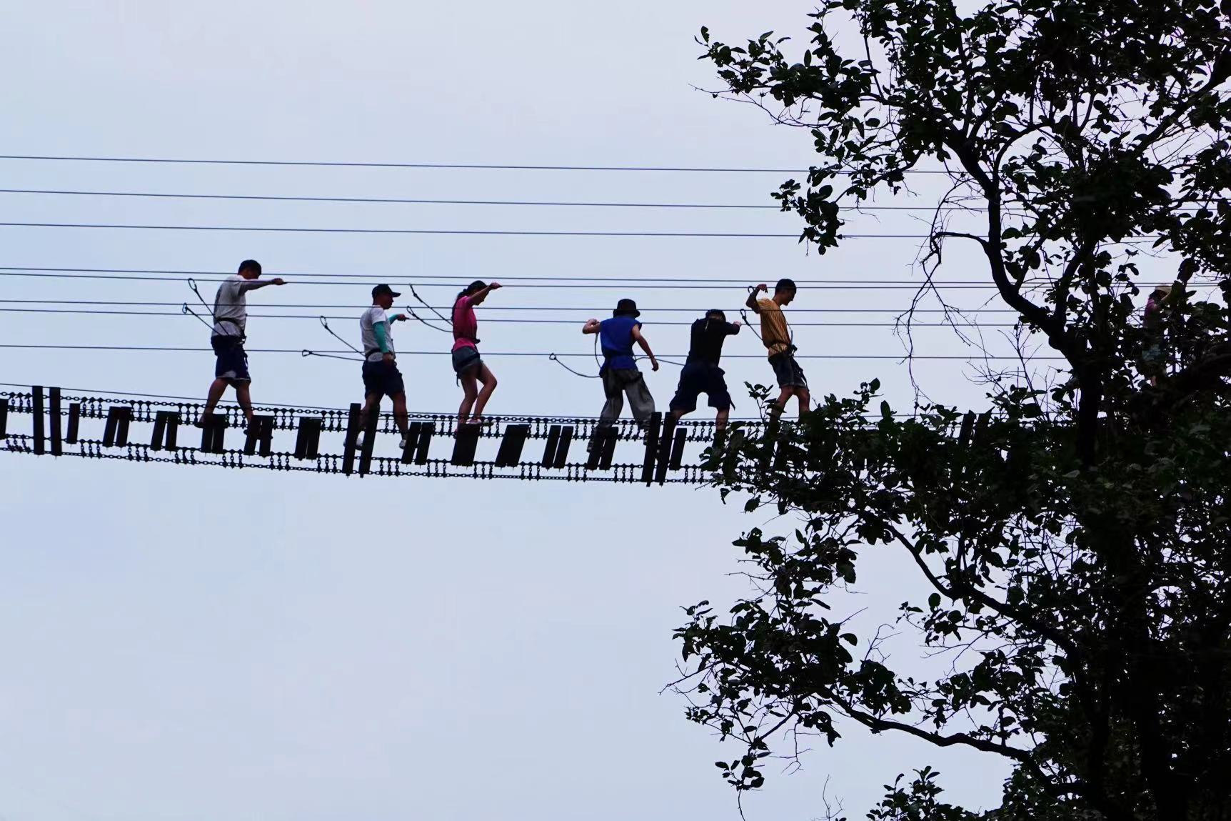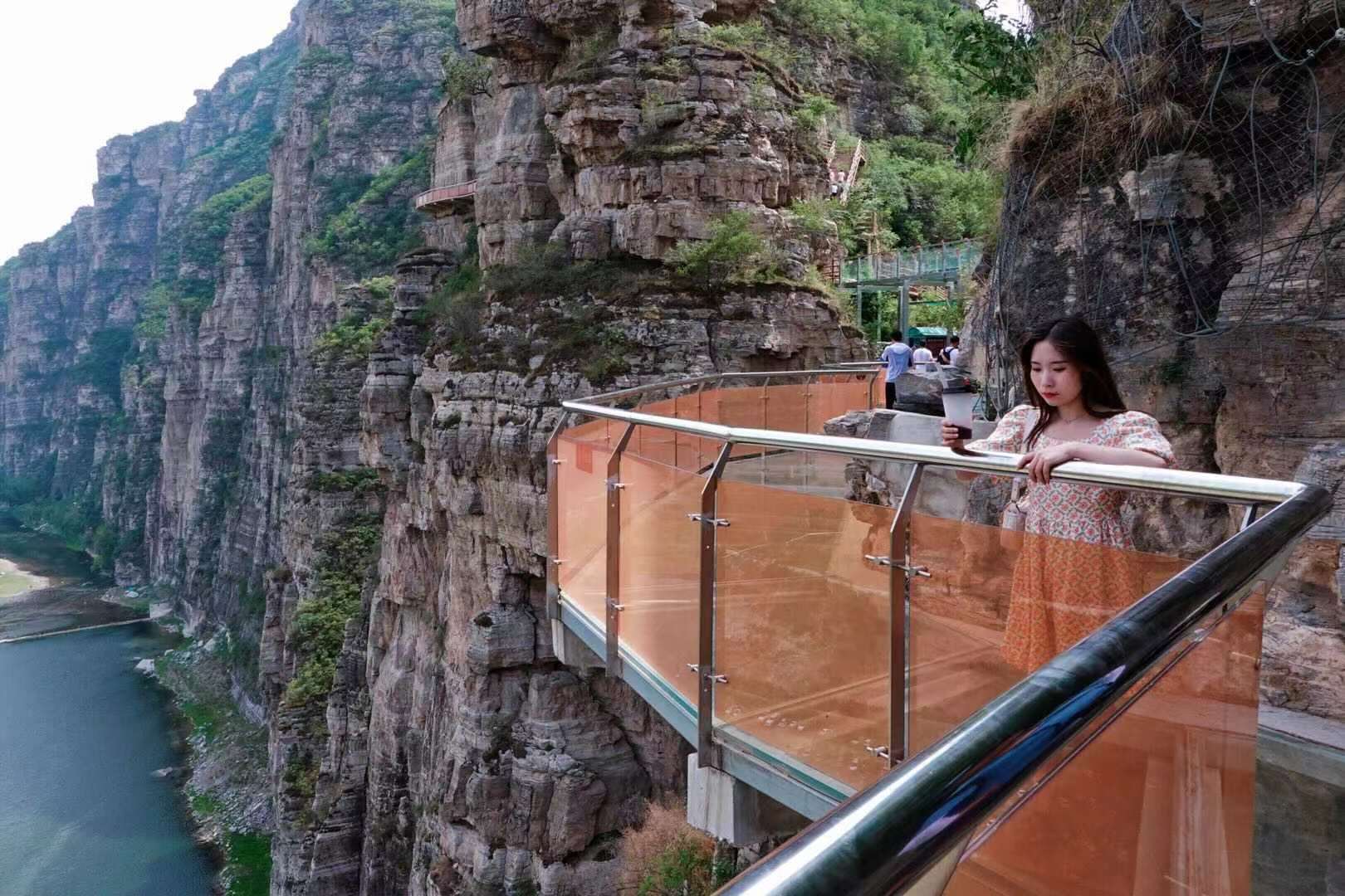 在紧邻拒马河的悬崖峭壁上,胆子大的人们正挂着安全绳,小心翼翼地沿着高空行走,脚下不宽的栈道和吊桥看着就极具挑战性。如果您胆量够大,这崖壁穿越的项目可太值得体验了。胆子小的朋友,可以走玻璃栈道和玻璃吊桥锻炼一下胆量。