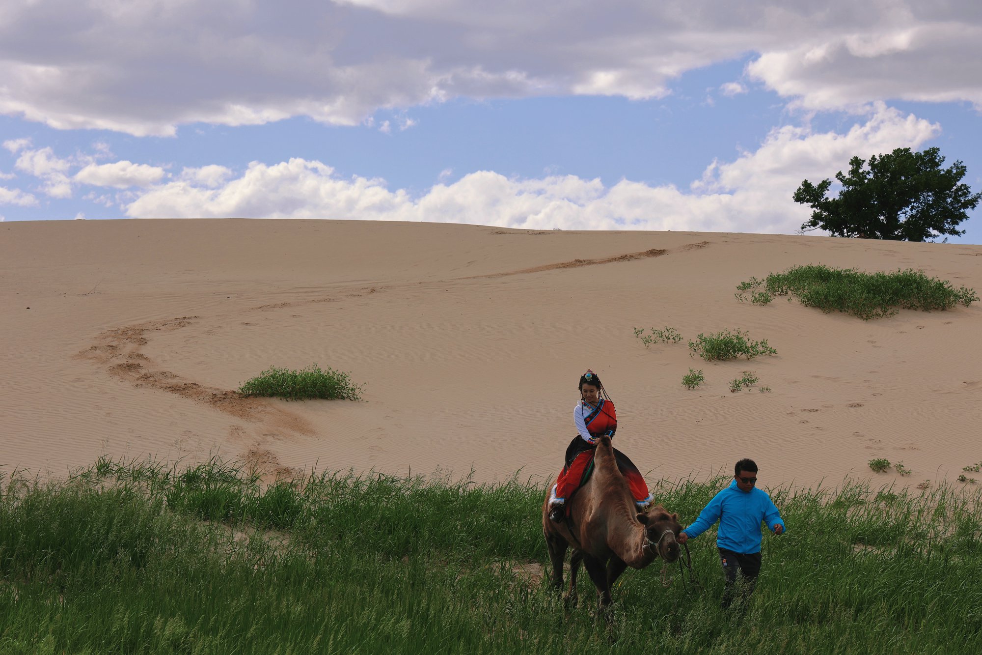 在骆驼骑乘区,女孩们纷纷换上景区提供的特色蒙古服装,与骆驼合影,并在工作人员的牵引下,骑着它在沙丘上走上一走,体会下沙漠骑乘的乐趣。