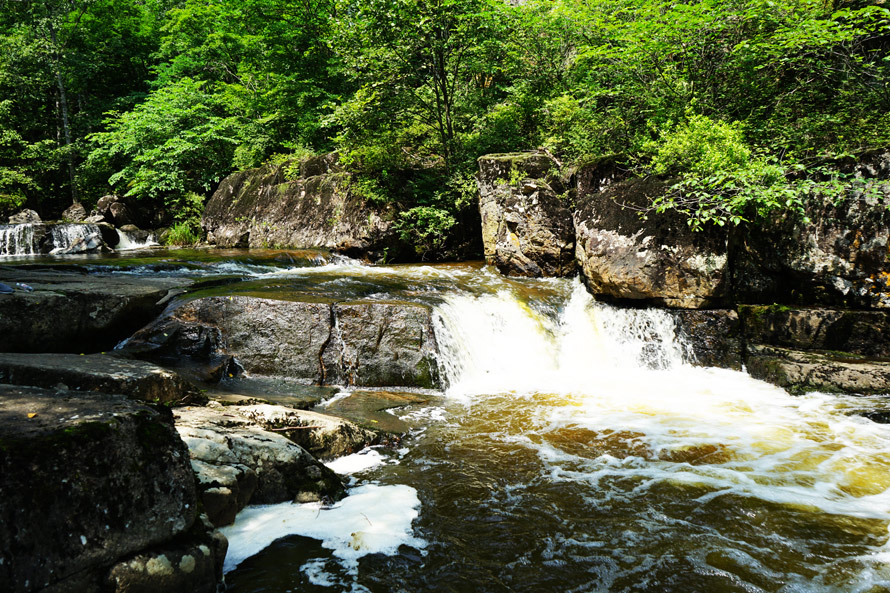 茅兰沟谷长15公里,两侧层峦叠嶂,群峰突起,走起来并不是很累。全程最累的地方大约就是黑龙潭附近一条高一两百级的天梯。天梯陡峭险峻,向上望去,山峰耸立,岗峦起伏。茅兰河在这里沿陡峭峡谷激流奔涌,斗折蛇行后蜿蜒而下,积水成为黑龙潭。虽然论规模和气势,茅兰沟的瀑布并不算什么,但在满目青山环绕中,它的出现还是会让人眼前一亮。